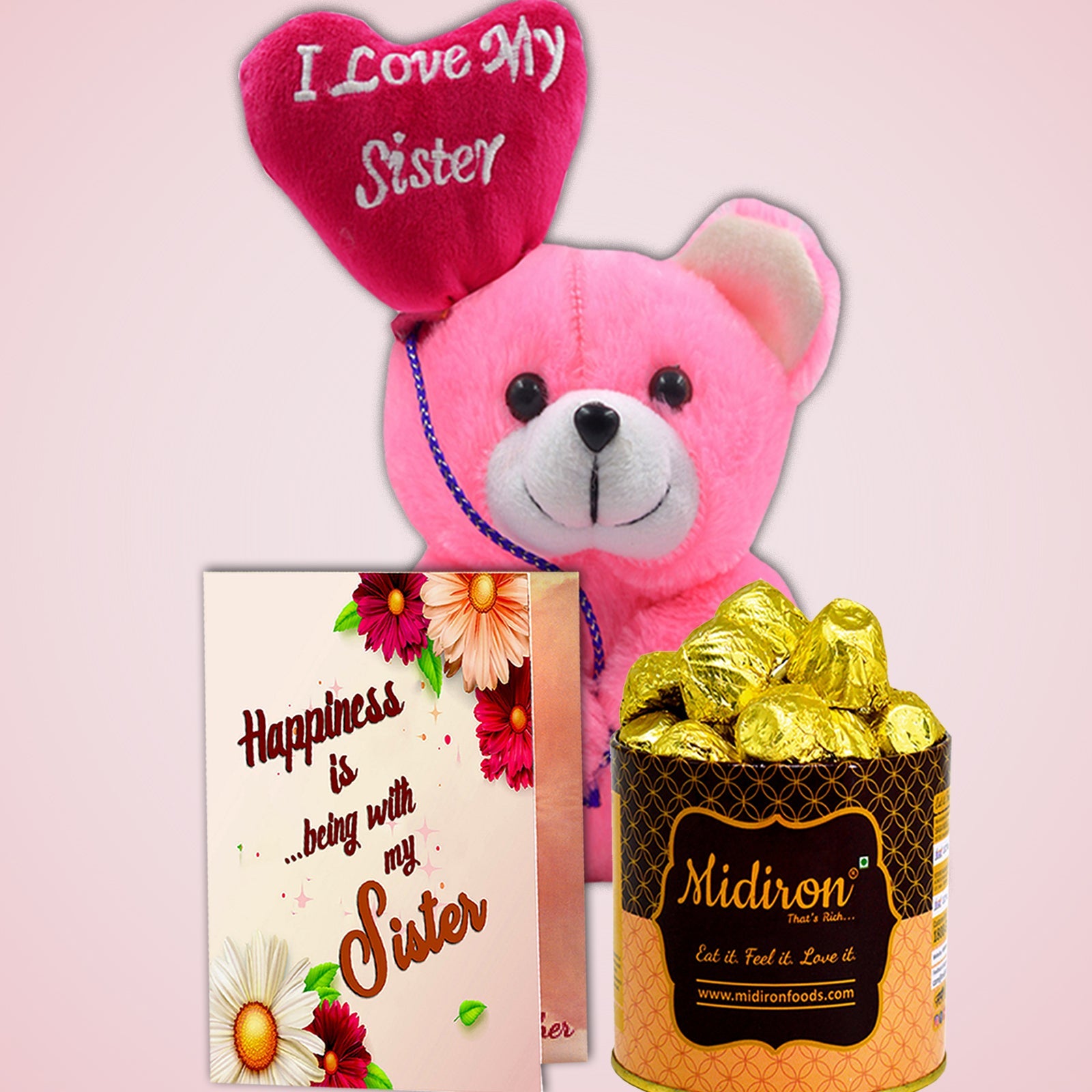 Make your sister smile this Raksha Bandhan with a thoughtful and affordable Rakhi gift that combines charm, sweetness, and festive warmth. This "Teddy Card Chocolate" Raksha Bandhan combo is specially designed to delight sisters of all ages. Whether you’re celebrating with your little sister or sending love to your elder sister from afar, this adorable gift hamper is an ideal expression of the sibling bond. A soft, huggable teddy bear, a vibrant Raksha Bandhan greeting card, and mouth-watering chocolates come together in a simple yet memorable gift combo that makes Rakhi celebrations extra special. Perfect for those looking for Raksha Bandhan gifts under 500, this combo balances quality with affordability.