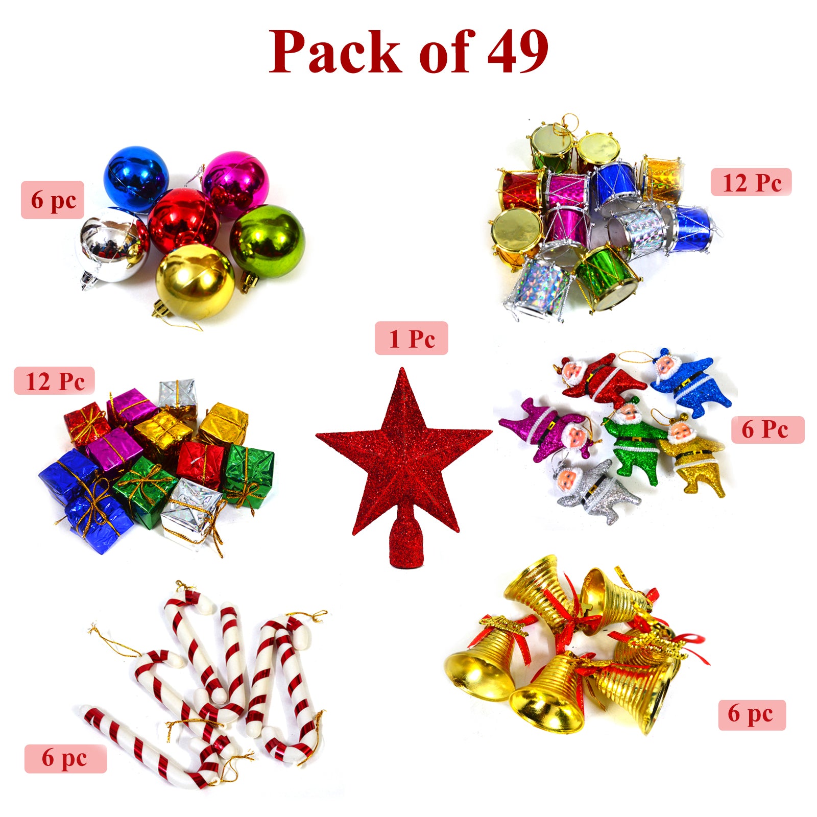 • Decoration Count: Includes 49 colorful ornaments — stars, bells, balls, ribbons, and gift boxes — to create a complete decorative setup.