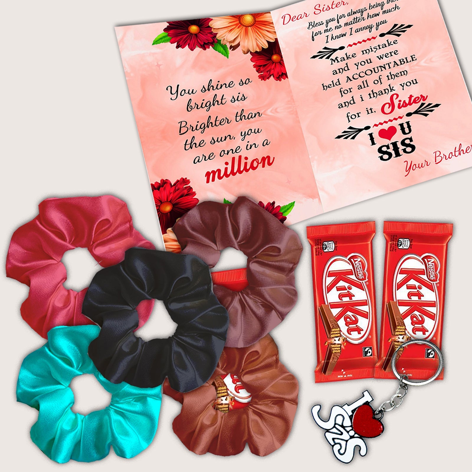 Celebrate Raksha Bandhan 2025 with a fun and vibrant gift combo specially crafted for sisters who love a mix of style, sweetness, and thoughtfulness. This Rakhi hamper features four cheerful essentials: soft scrunchies, a funky key chain, a printed Rakhi greeting card, and a chocolate bar. Ideal for school-going girls, teenage sisters, or fashion-forward college-goers, this compact and useful Rakhi combo is sure to add joy to her day without stretching your budget.