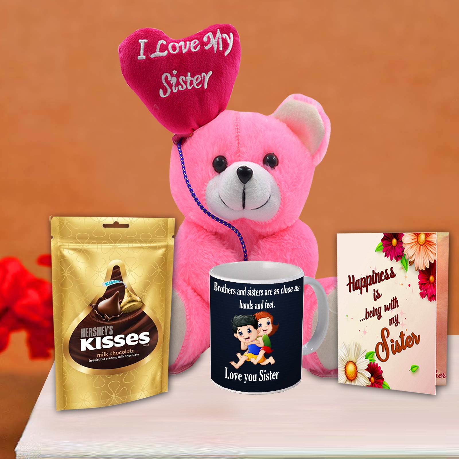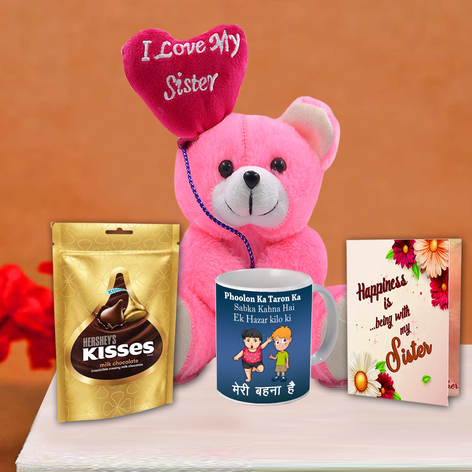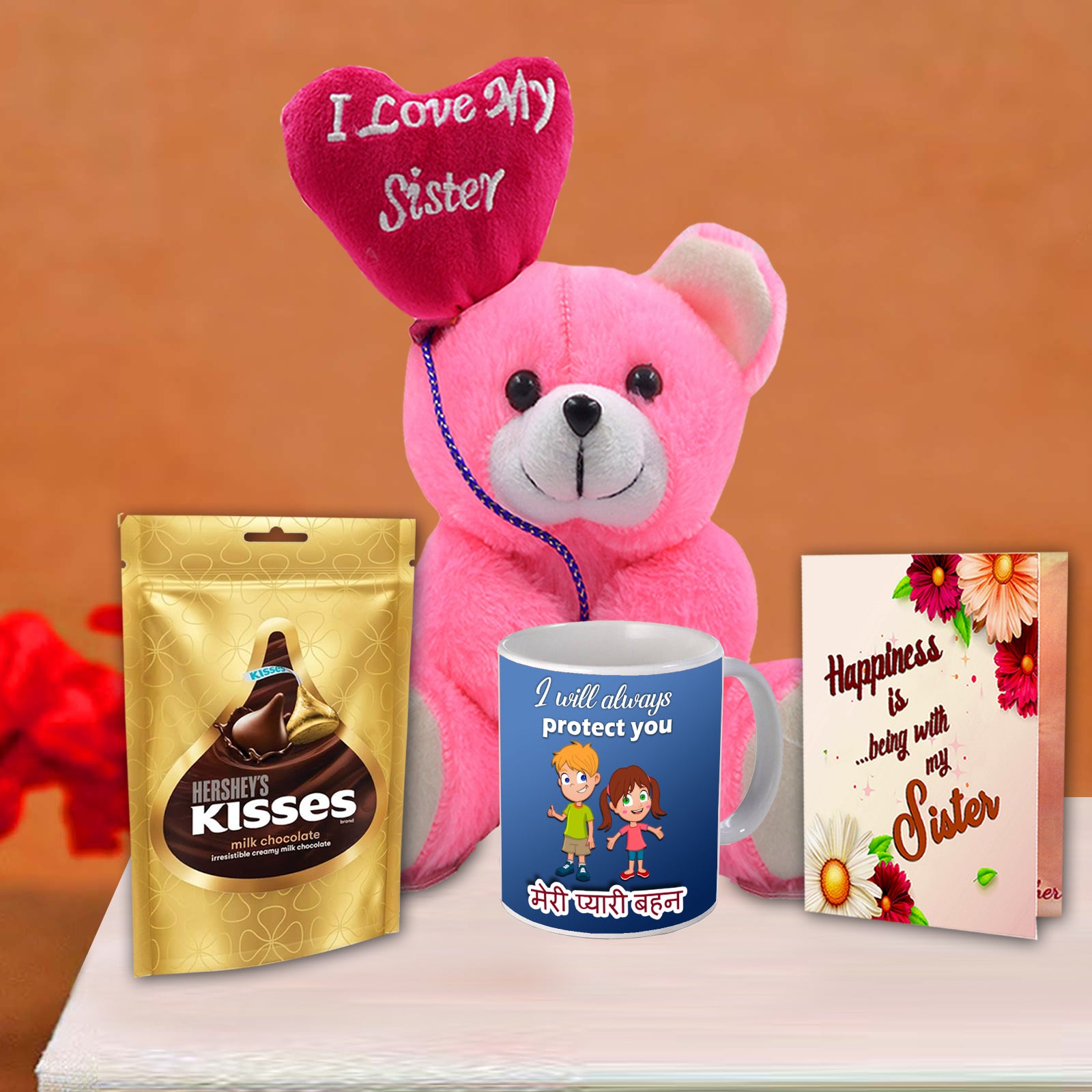 This Rakhi, celebrate the beautiful bond you share with your sister by gifting her something that mirrors your affection. Presenting the “Hug of Love” Rakhi Gift Hamper—a warm, joy-filled set that brings together comfort, sweetness, and heartwarming emotion. Thoughtfully curated to make your sister feel deeply cherished, this hamper includes a designer printed coffee mug, a cuddly I Love Sister teddy bear, a pouch full of delicious chocolates, and a sweet sister greeting card. Each item is a token of love—simple yet meaningful, charming yet timeless. Let this Rakhi be the moment she feels just how much she means to you.