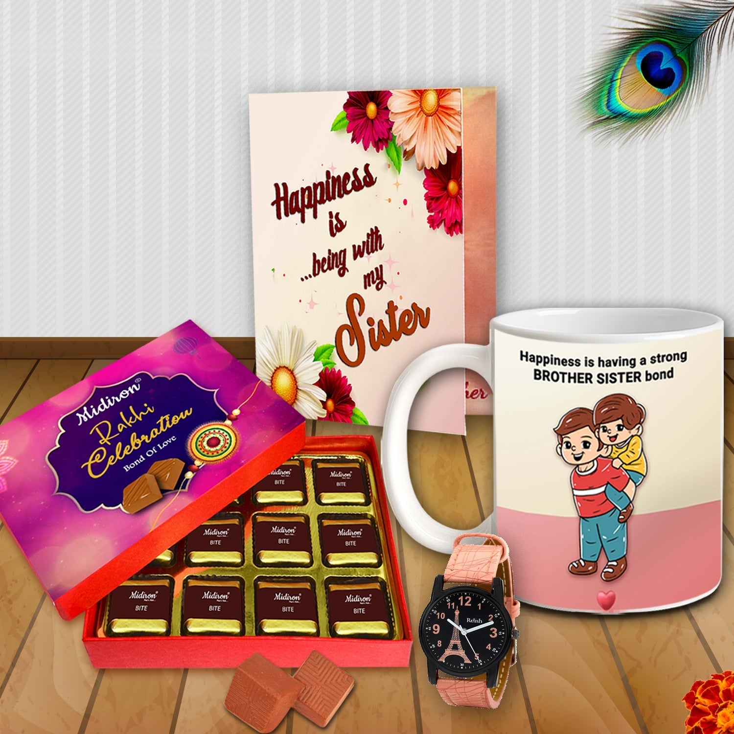 With a charming printed coffee mug, a stylish analog watch, a delectable box of chocolates, and a greeting card ready for your personal words, this gift set is designed to make your sister feel truly cherished. Ideal for every occasion — or even as a spontaneous gesture of affection — it’s the perfect way to show her just how much she means to you.