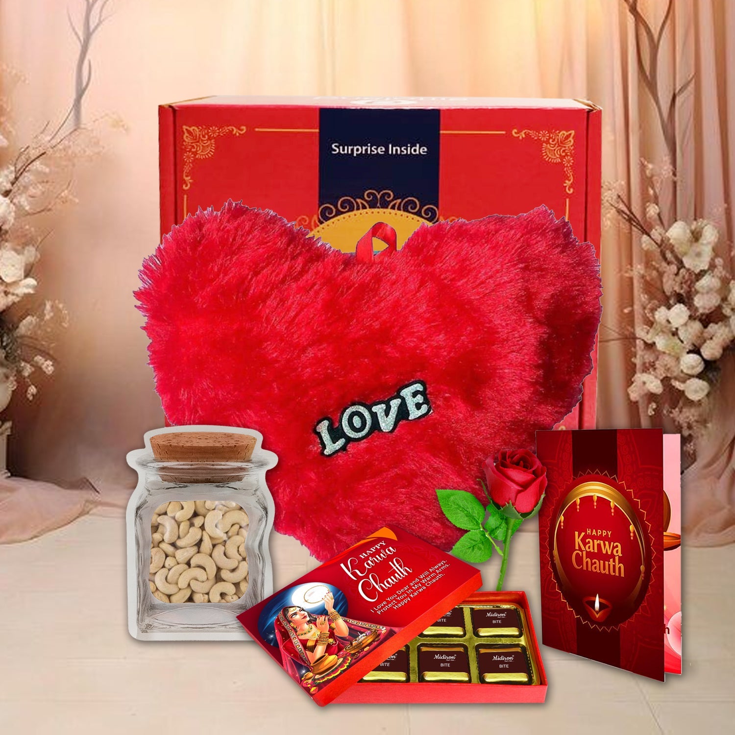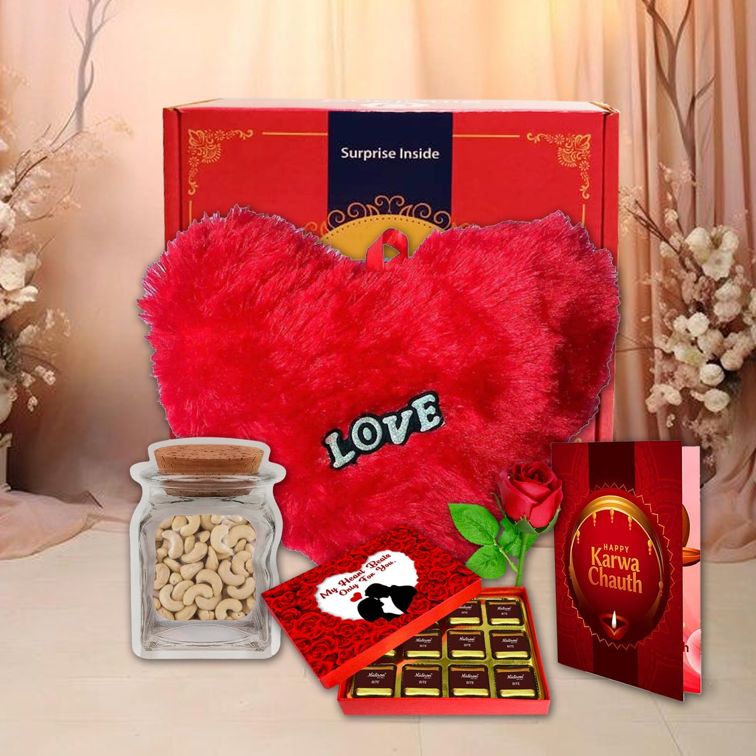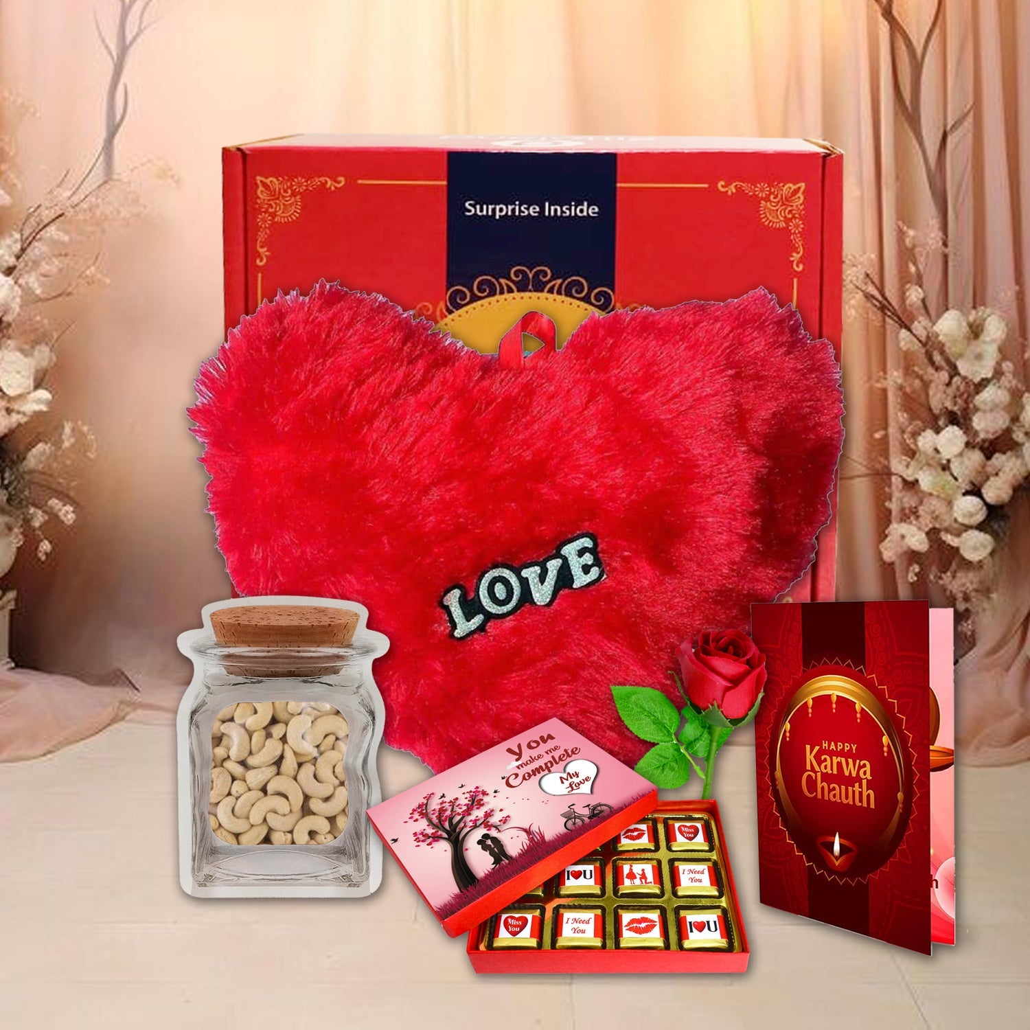 Celebrate Karwa Chauth with a heartfelt gesture that captures both tradition and romance. This specially curated Karwa Chauth Gift for Couple is designed to express love, care, and celebration all in one beautifully arranged package. Featuring a soft Big Red Heart, indulgent 100gm cashew pack, delectable chocolate box, meaningful printed card, and an eternal symbol of love—an artificial rose—this gift combo offers everything needed to make your loved one feel extra special on this auspicious day. Whether you're surprising your wife, husband, or both celebrating together, this combo brings together affection, nourishment, and thoughtfulness.
