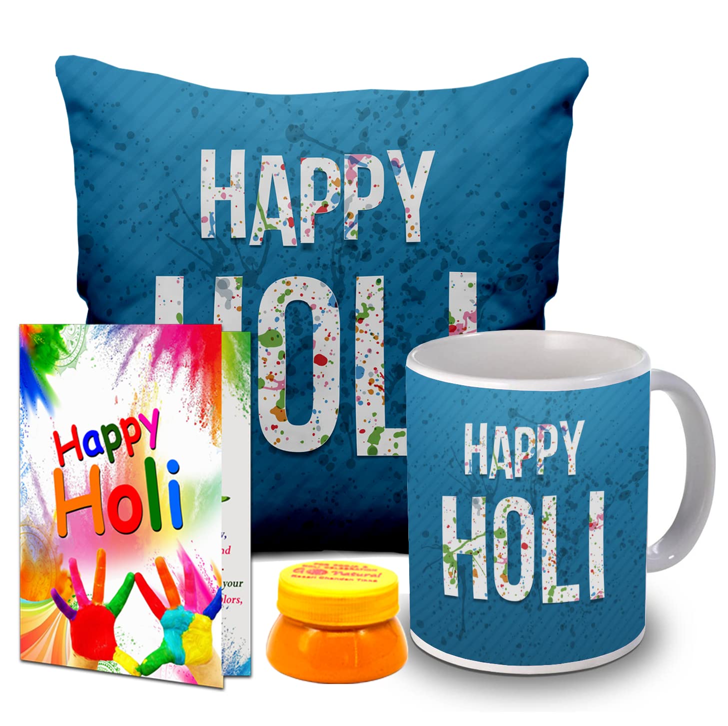 Celebrate Holi with a blend of warmth, happiness, and tradition with our Printed Cushion, Printed Coffee Mug, Greeting Card & Chandan Tilak set. Whether you're near or far, this thoughtful gift will bring smiles and festive joy to your loved ones.