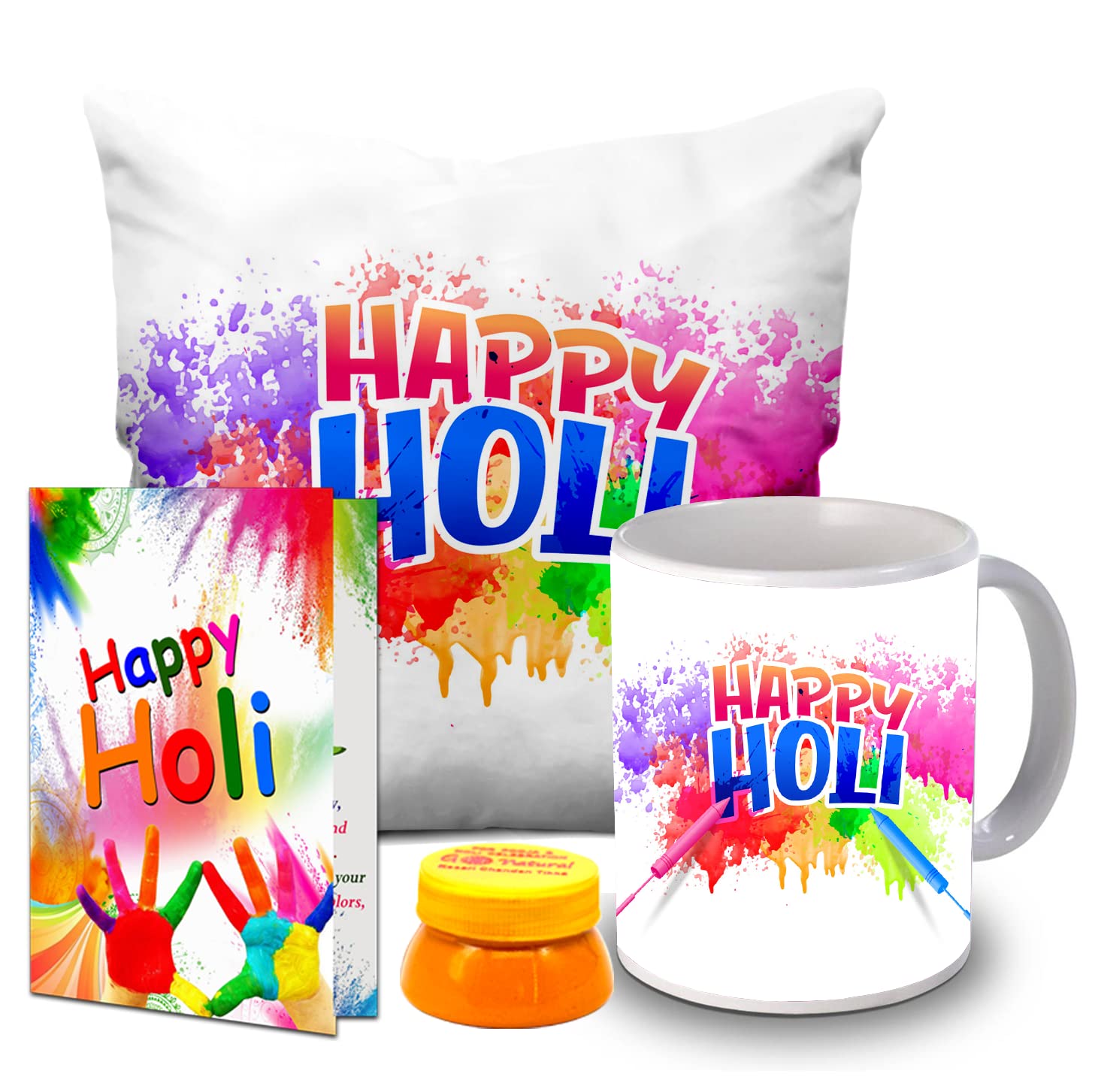 Celebrate the joy and traditions of Holi with the Printed Cushion, Printed Coffee Mug, Greeting Card & Chandan Tilak gift set. Perfect for sharing festive cheer, warmth, and blessings with those who matter most.