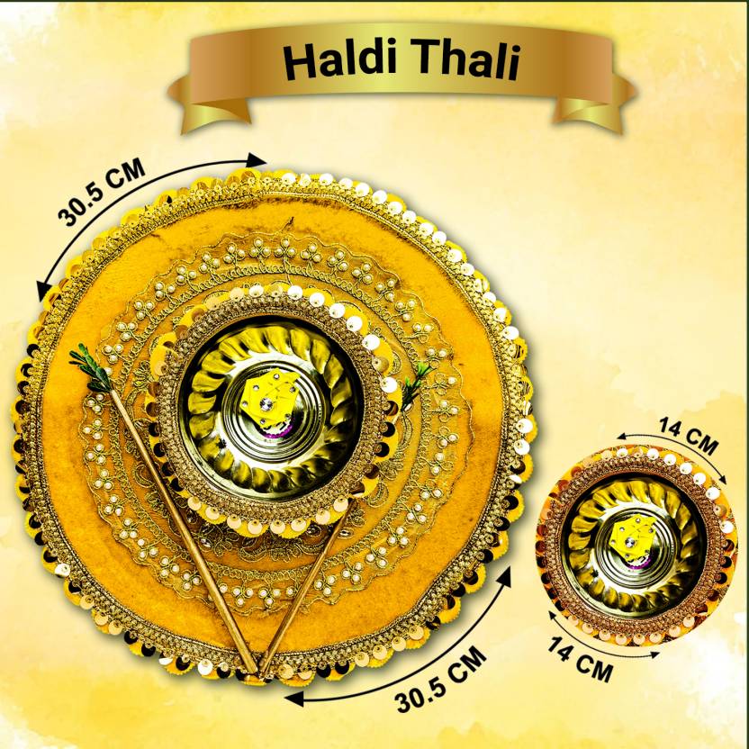 The Haldi Thali is more than just an accessory—it is a vital part of wedding traditions in many regions of India. During the wedding, the bride and groom are ceremonially smeared with turmeric, symbolizing prosperity, health, and beauty. This is followed by prayers and blessings from elders. The thali, therefore, is a visual representation of love, purity, and blessings, which makes it an essential part of the ceremony.