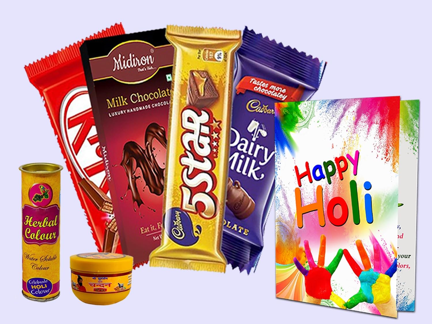 ✔ Complete Festive Package – Includes 4 chocolate bars, chandan tika, water color, and greeting card.