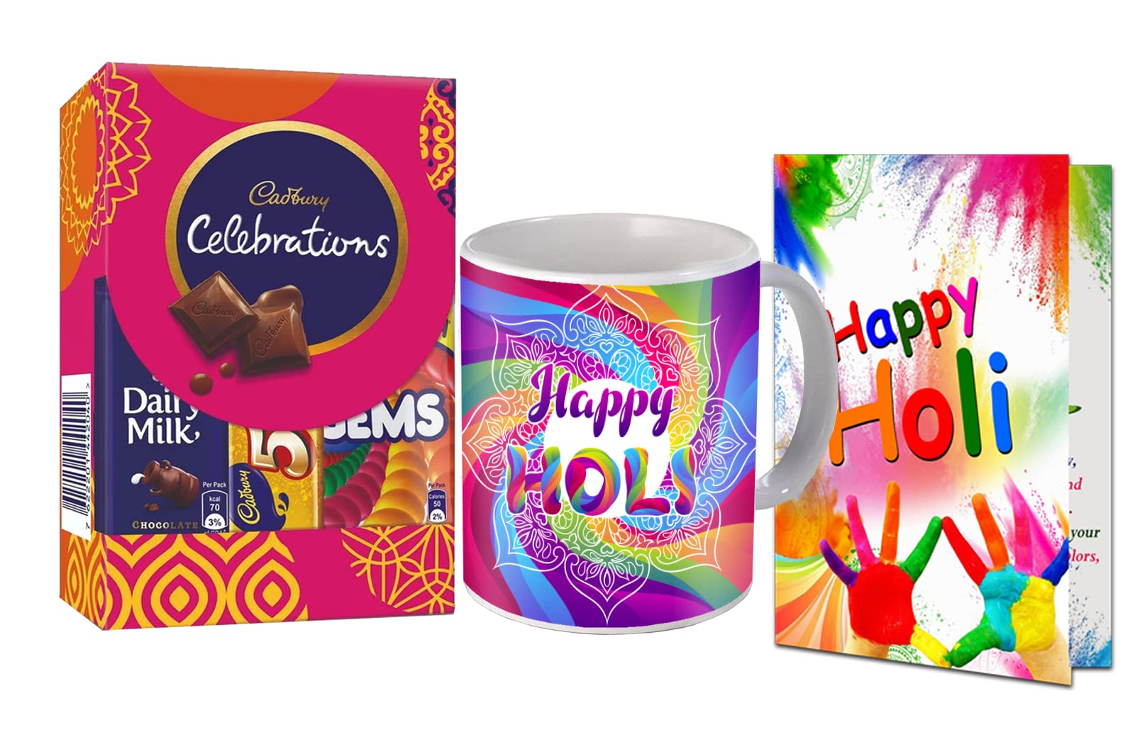 ✔ Complete Festive Package – Includes Cadbury box, Holi printed coffee mug, and greeting card.