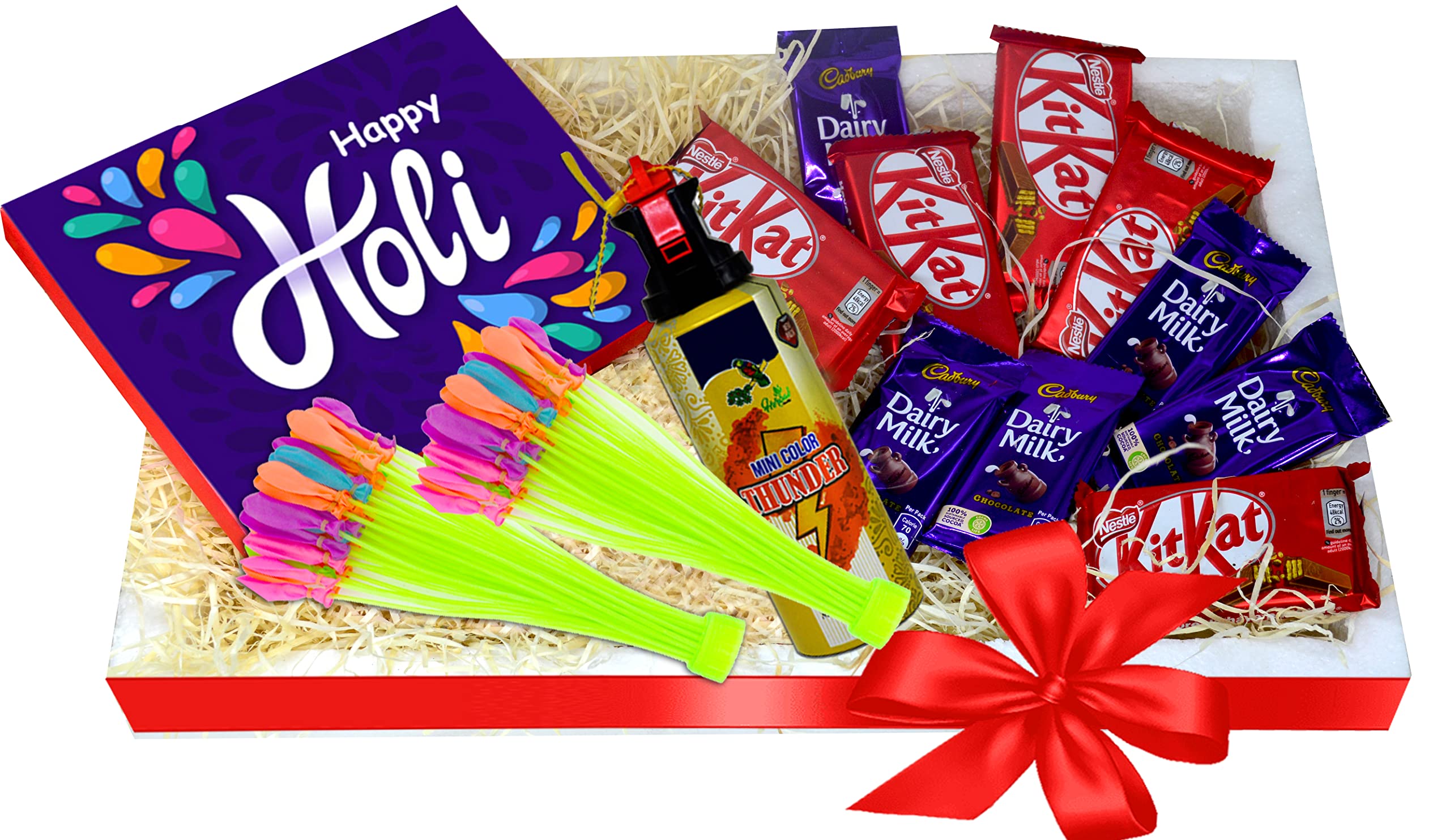 Enjoy the Chocolates – Savor the premium Holi chocolate box, Kitkat, and Dairy Milk with loved ones.