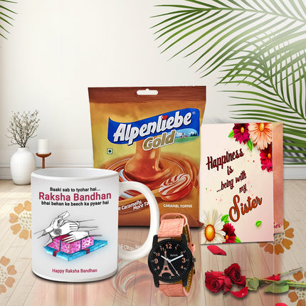 Introducing the “Time & Treats Rakhi Gift Set”—a heartwarming and thoughtful hamper created to reflect the unique love between siblings. Whether you’re near or far this Rakhi, this beautifully curated set ensures your feelings reach your sister in the most meaningful way. With a stylish analog watch, a designer coffee mug, a pouch of chocolate candies, and a sister greeting card, this gift set is the perfect blend of elegance, emotion, and everyday joy.