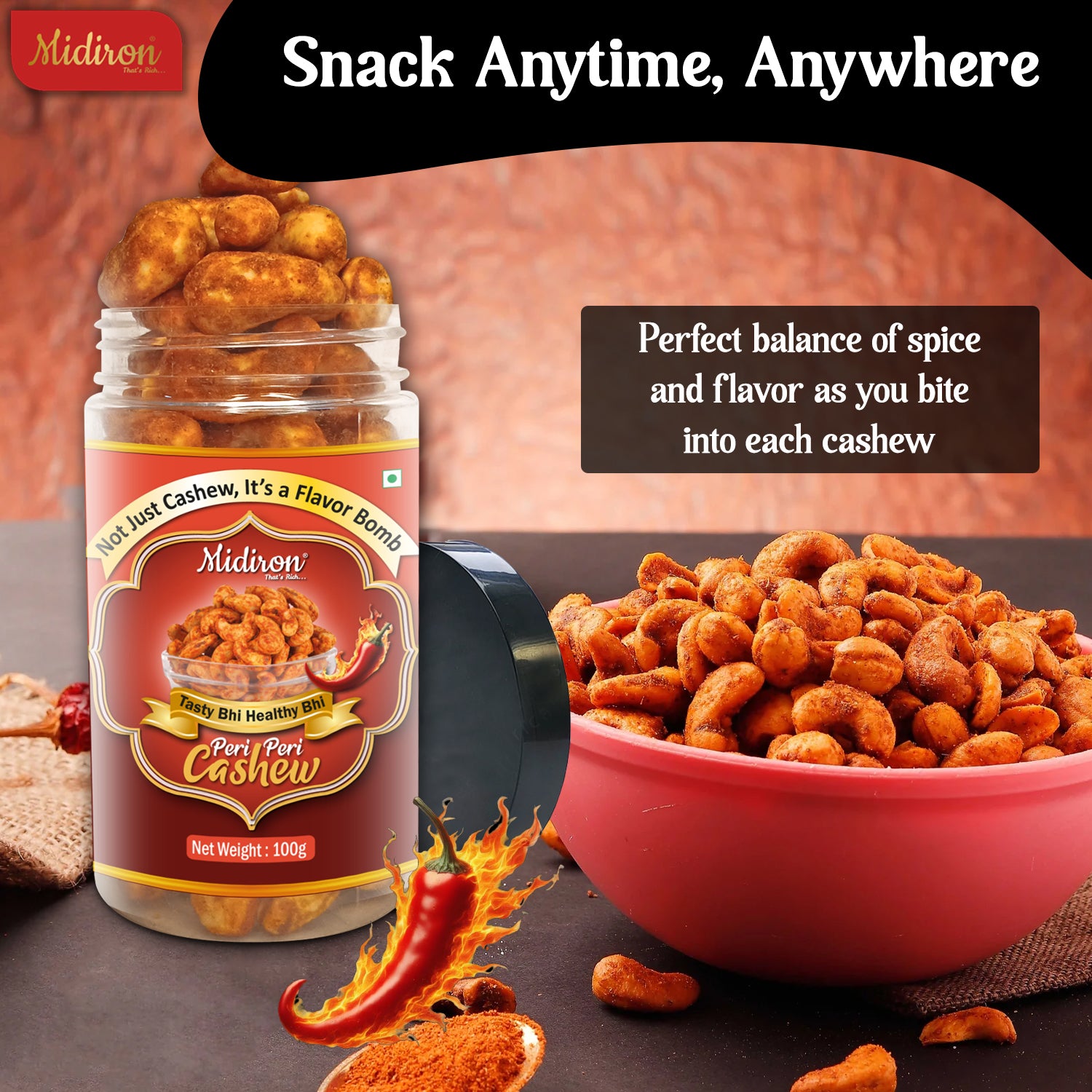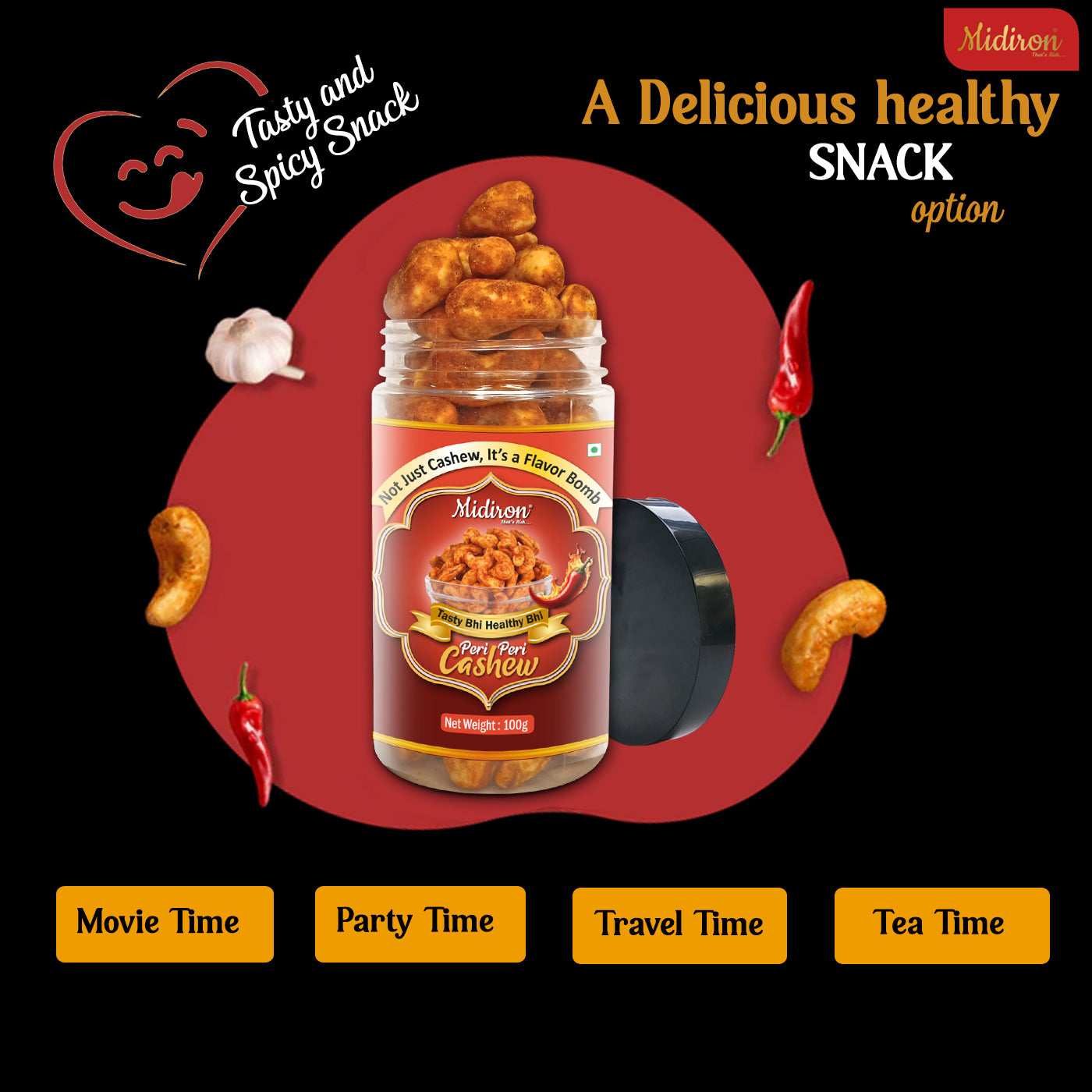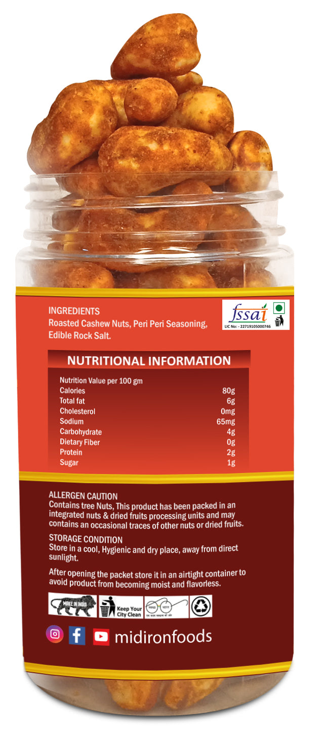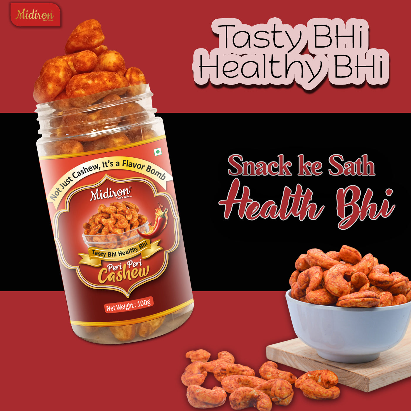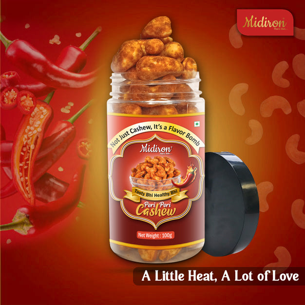 Cashews are a natural source of plant-based protein, magnesium, zinc, and heart-healthy fats. Our roasted masala cashews with peri peri flavor are a wholesome snack that supports your energy levels without the crash of sugary foods. Ideal for fitness-conscious snackers, busy professionals, students, and anyone looking for healthy spicy snacks with a desi twist.