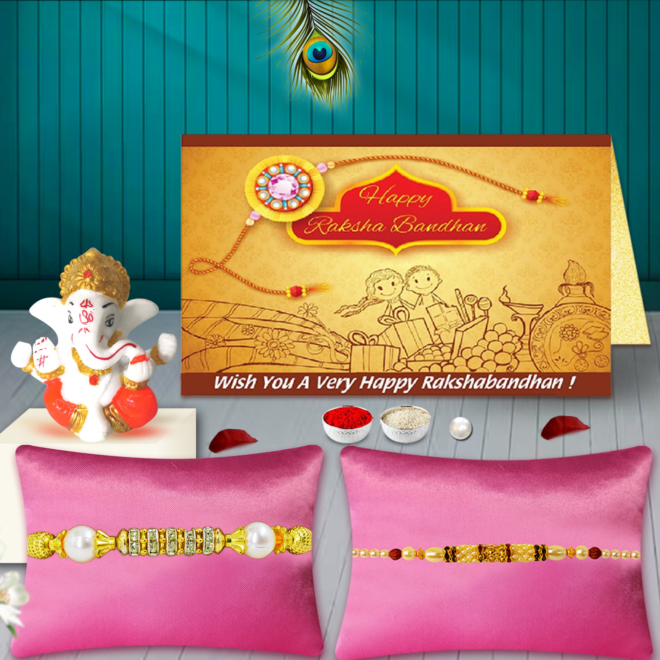 Raksha Bandhan is more than a ritual—it’s a heartfelt celebration of the unbreakable bond between siblings. Make this year’s celebration extra special with a thoughtfully assembled rakhi combo for brother that blends tradition, love, and convenience. This well-packed combo includes 2 rakhi for brother, a spiritual Ganesh statue, a printed greeting card, and sacred roli and chawal—everything needed for a traditional Raksha Bandhan ceremony in one elegant box. If you're on the lookout for a touching yet practical rakhi gift combo for brother, this set captures both spiritual depth and emotional warmth.