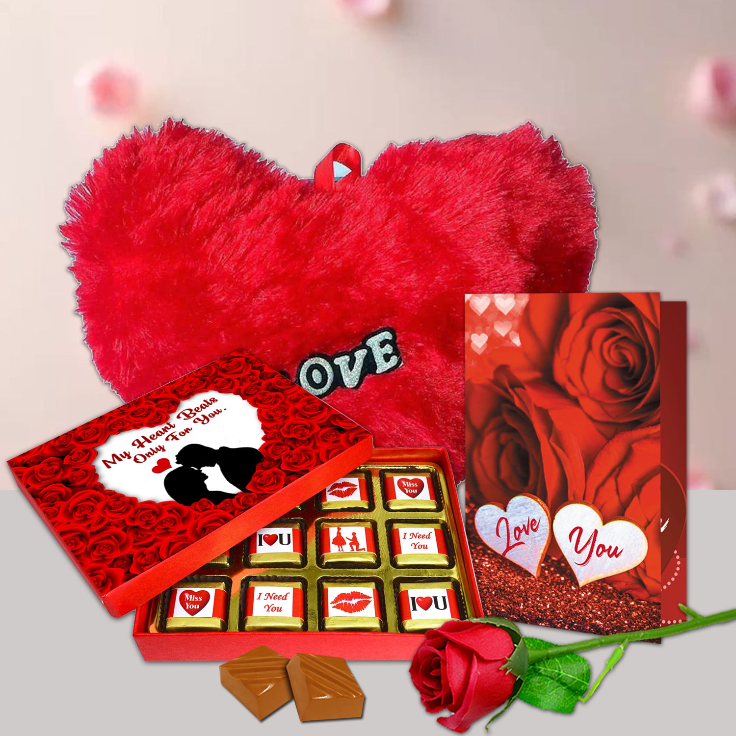 A thoughtfully curated love gift hamper combining chocolates, rose, heart pillow, and greeting card, offering a complete romantic gifting solution in one elegant package.