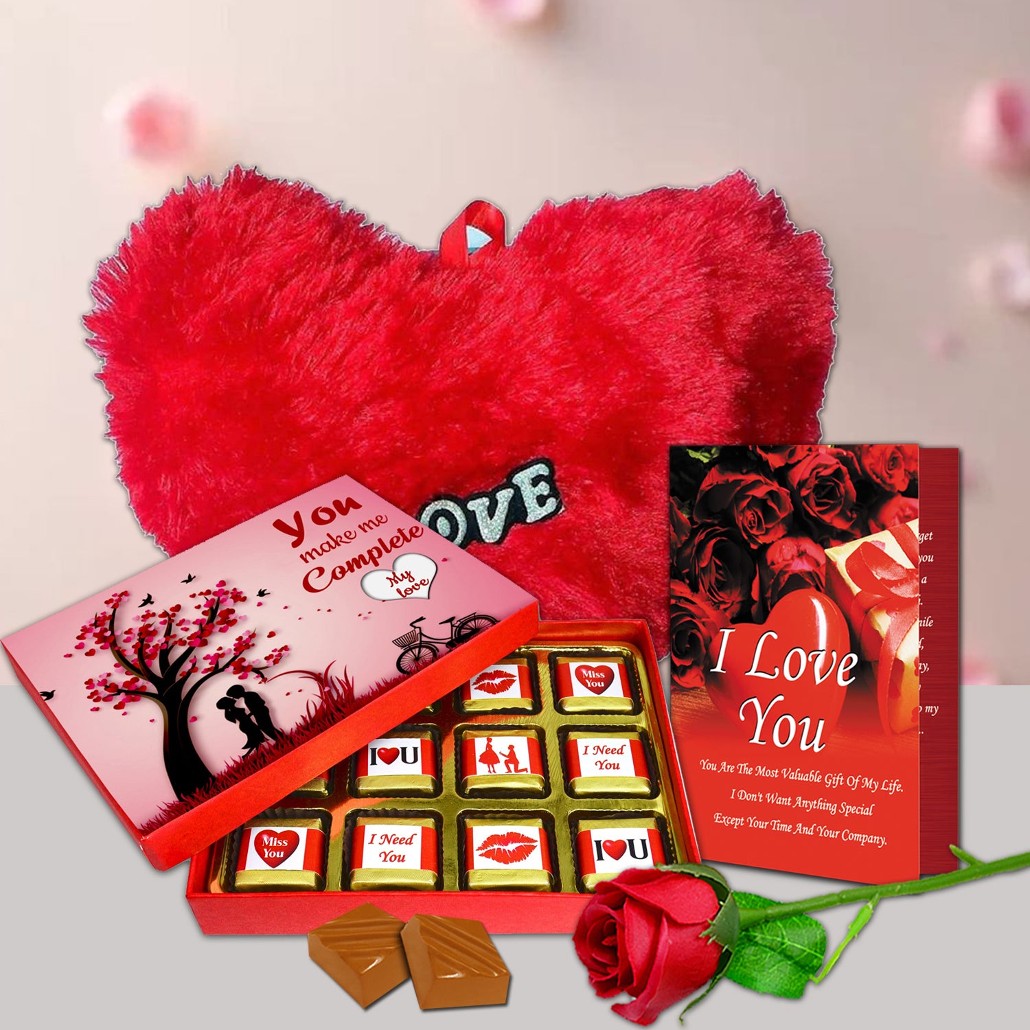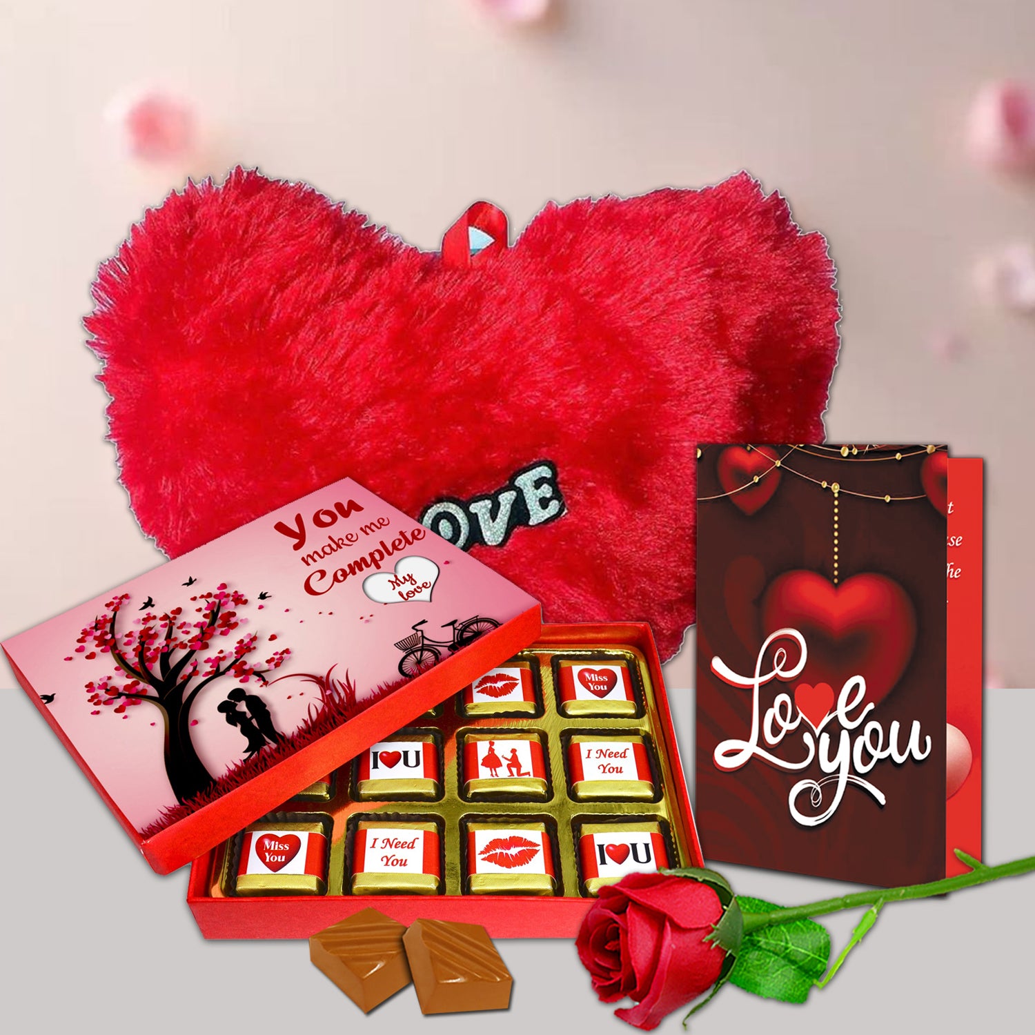 Includes chocolates, artificial red rose, heart pillow, and greeting card. A complete love gift combo designed to express romance, care, and affection in one elegant package.