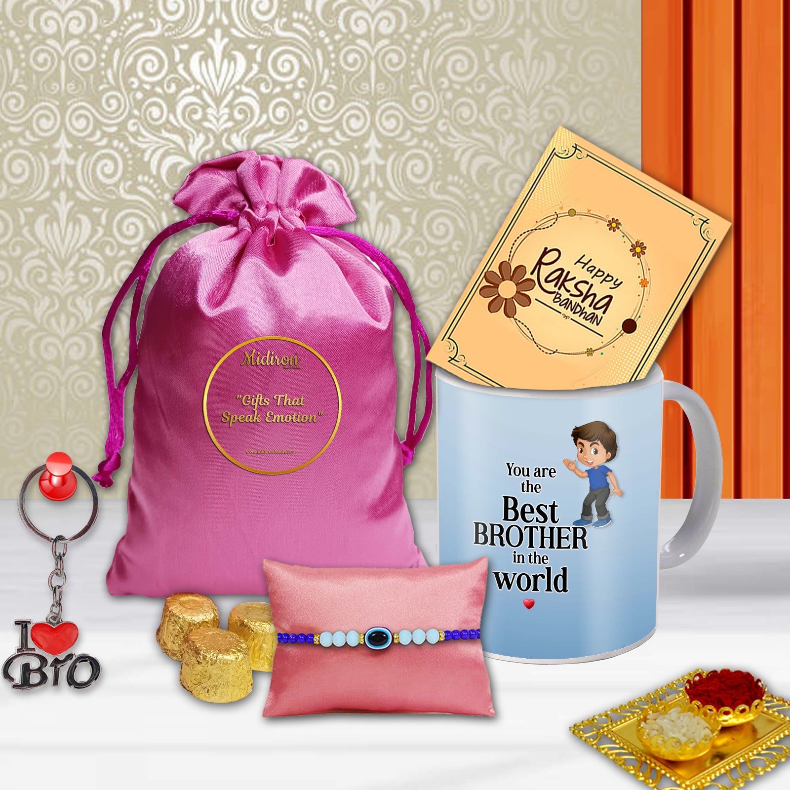 If your brother is away from home, this hamper helps bridge the distance. Packed with everything needed for a traditional Rakhi celebration—rakhi thread, sweets, message on the mug, greeting through the keychain, and rituals with roli chawal—it’s a one-box celebration delivered right to his doorstep.