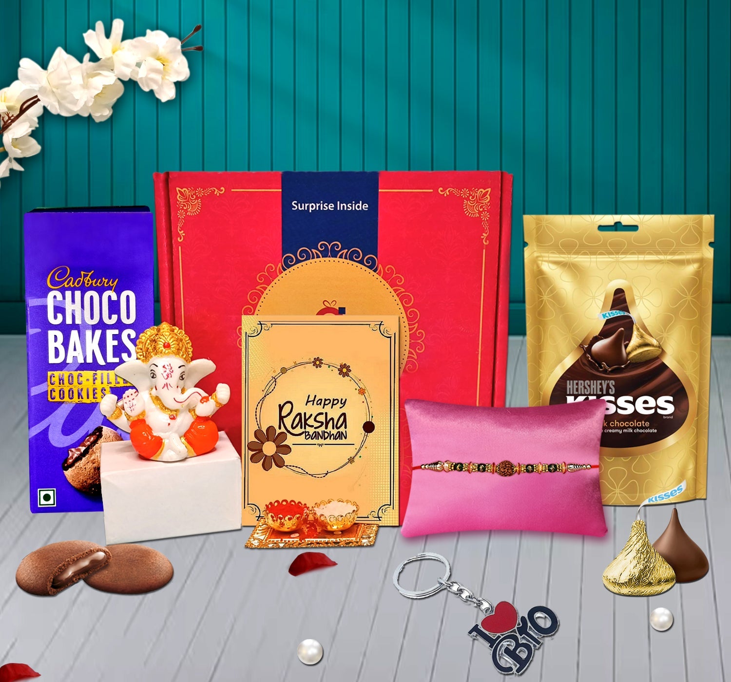 Chocolate Packet, Chocolate Cookies, Ganesh Idol, “I Love Bro” Keychain, 1 Designer Rakhi, Printed Rakhi Card, Roli and Chawal.