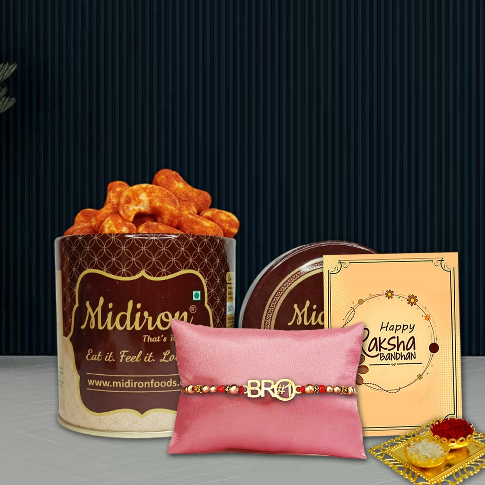 This Rakhi combo effortlessly blends the charm of old customs with the excitement of modern flavours. Instead of traditional sweets, it offers a spicy treat that aligns with contemporary tastes. Yet, it preserves the core traditions with a rakhi, roli, chawal, and heartfelt card. It’s ideal for sisters who want to make their gift memorable without straying from the true spirit of the festival. From the thoughtful presentation to the flavorful cashews, every element of this gift speaks volumes.