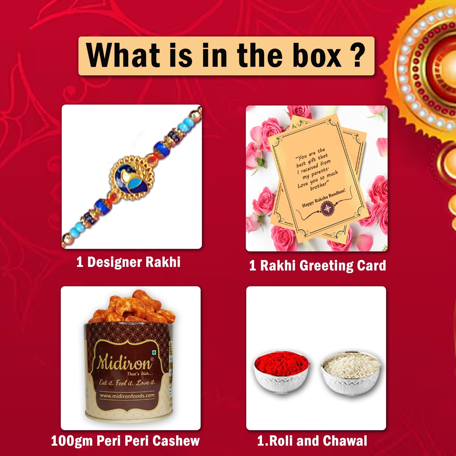 If you’re looking to send Rakhi to your brother across the country, this combo is designed to travel well. The Peri Peri cashews are securely packed, the Rakhi and card are protected, and the roli-chawal is in a spill-proof pouch. This makes it a convenient and safe gift for long-distance siblings. Whether your brother is working in another city or studying far away, this hamper brings joy, love, and festive flavour right to his doorstep.