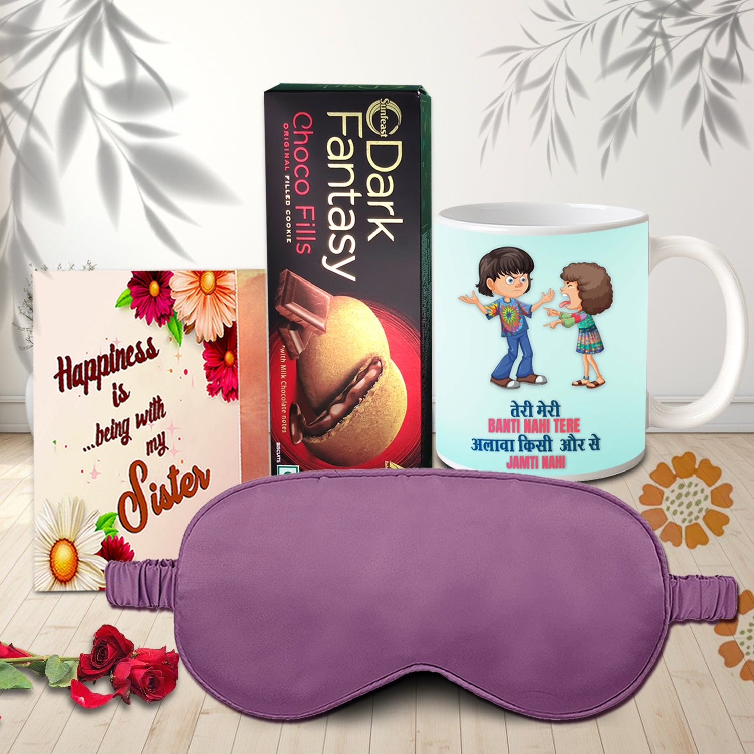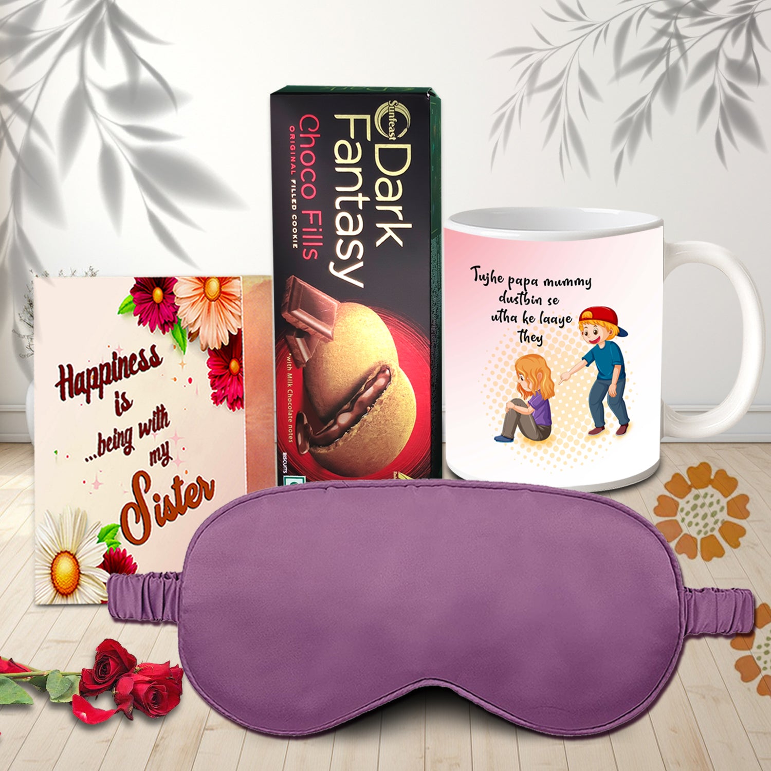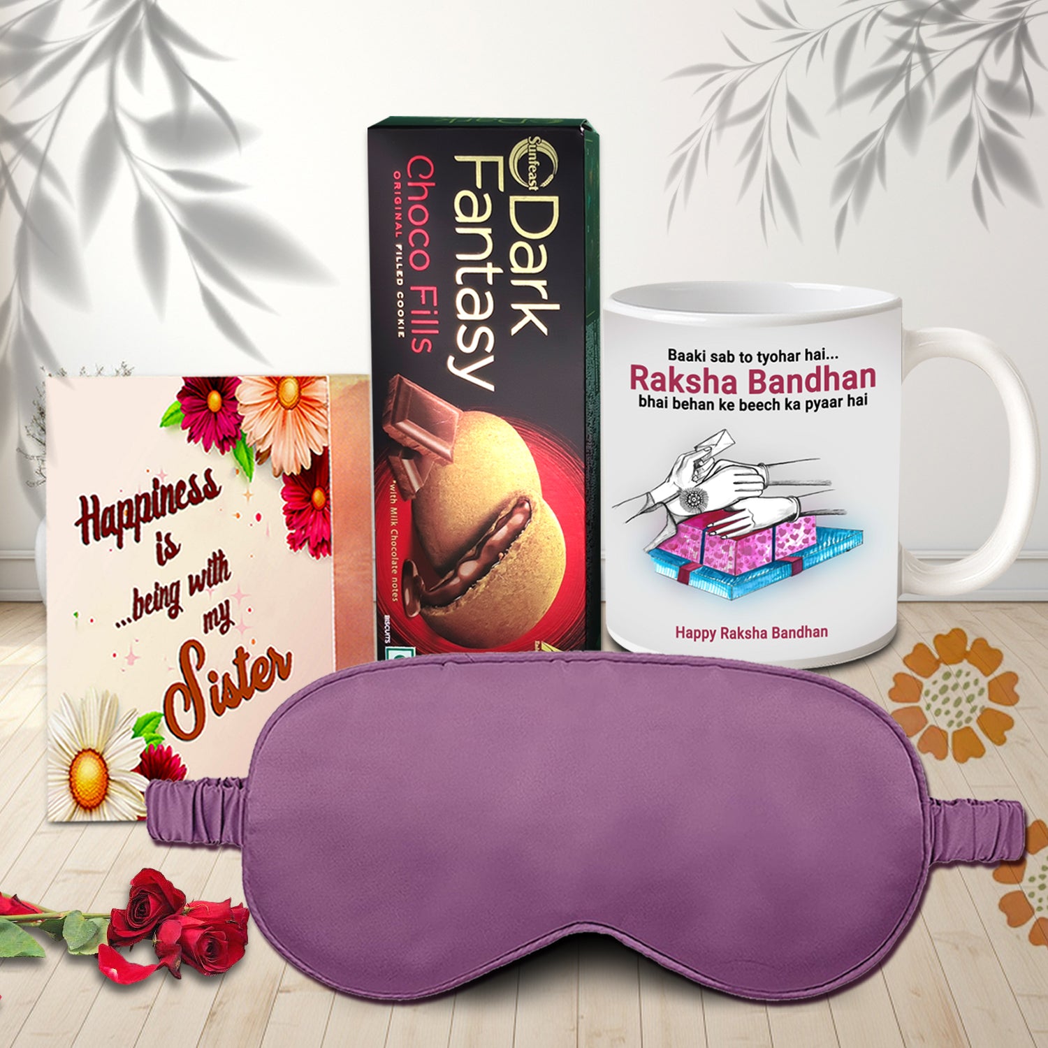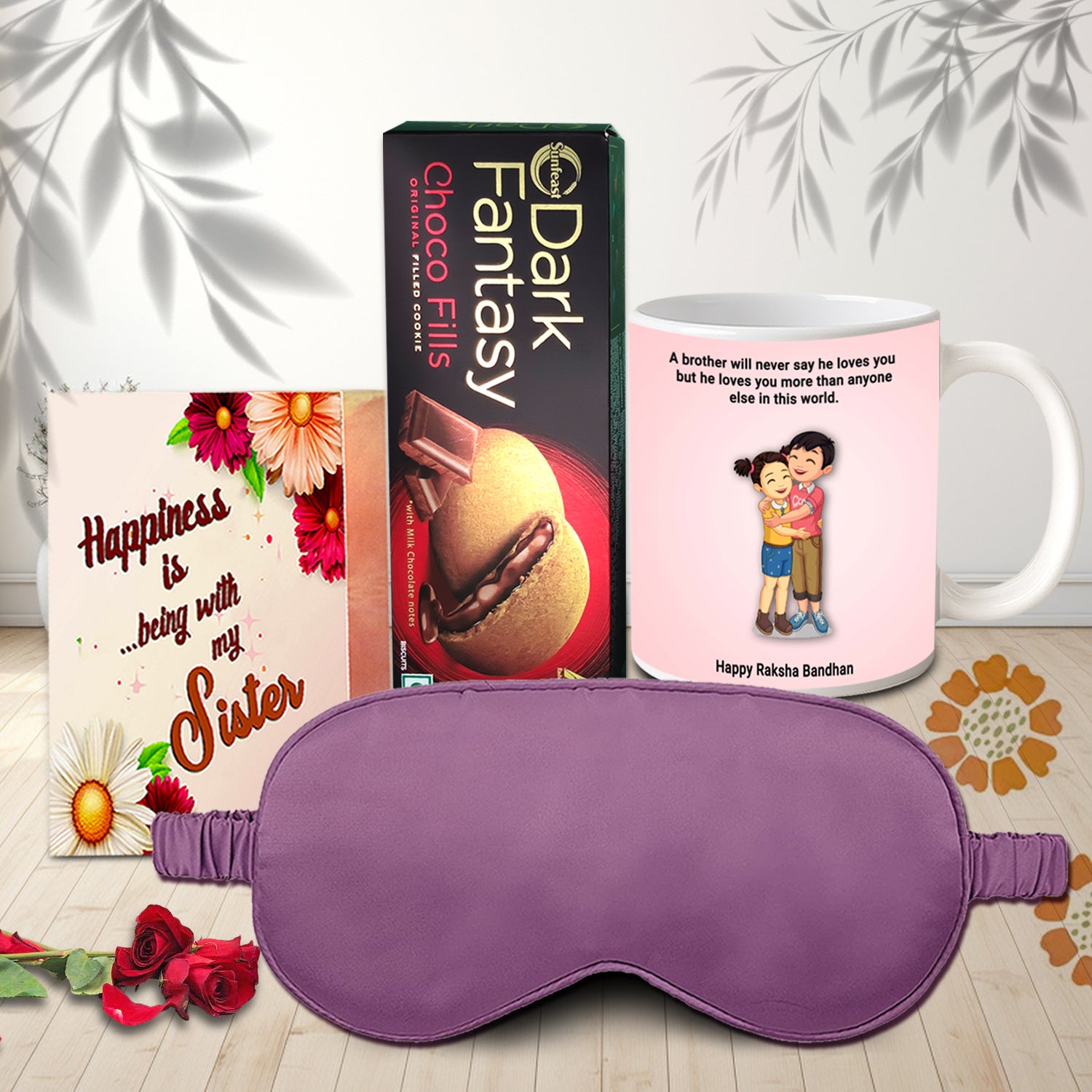 Raksha Bandhan is that beautiful time of year when you pause to cherish the irreplaceable bond you share with your sister. It’s not just about tying a thread—it's about honoring the love, care, and support you’ve given each other through every high and low. This specially curated Rakhi gift combo blends warmth with comfort, perfect for the sister who deserves a little extra TLC. With a cozy eye mask, a charming printed coffee mug, delicious chocolate cookies, and a heartfelt greeting card, this hamper says what words often can't: “You matter to me.”