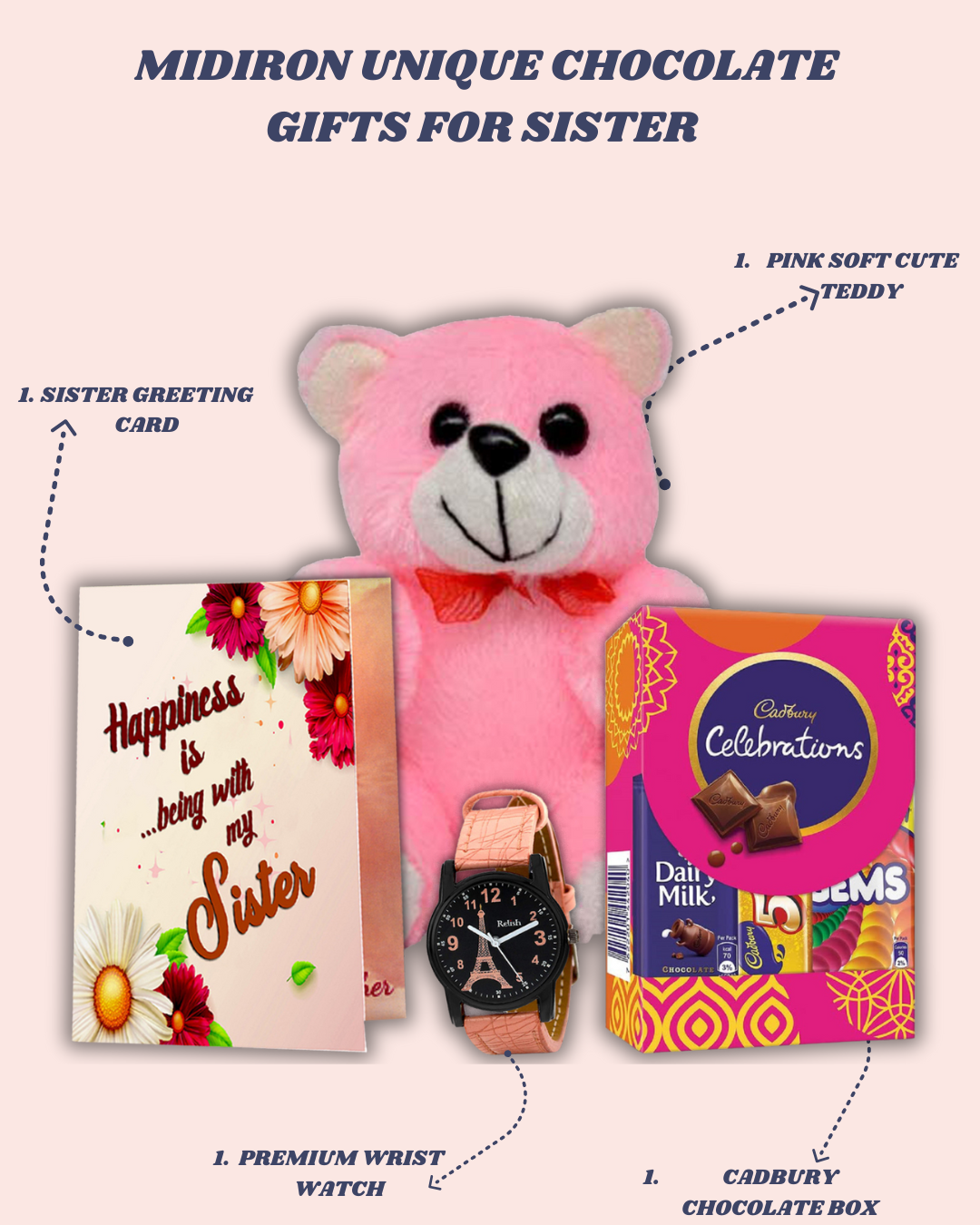 This Raksha Bandhan, give your sister the ultimate Rakhi gift hamper that celebrates your sibling bond in the sweetest way. With Cadbury Celebration chocolates, a heartfelt Rakhi greeting card, a stylish watch, and a cuddly teddy bear, this combo brings together the best of sweet treats, practical accessories, and personal touches to create the perfect gift.