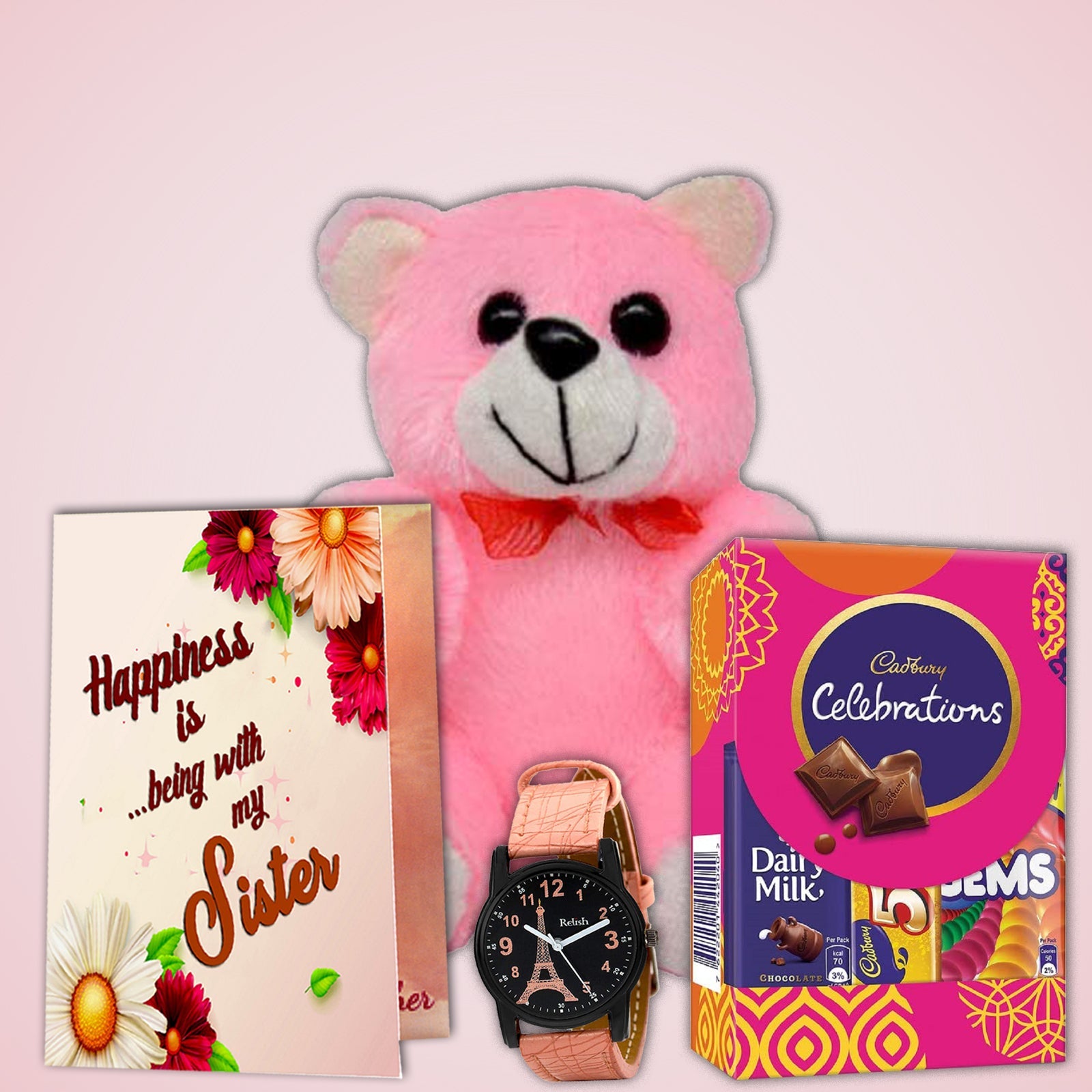 If you are searching for Rakhi gifts for teenage sisters, adult sisters, or even affordable Rakhi gift hampers, this set offers something for everyone. The thoughtful combination of teddy bear, Cadbury chocolates, watch, and greeting card makes this hamper a versatile gift that can be enjoyed by sisters at every stage of life.