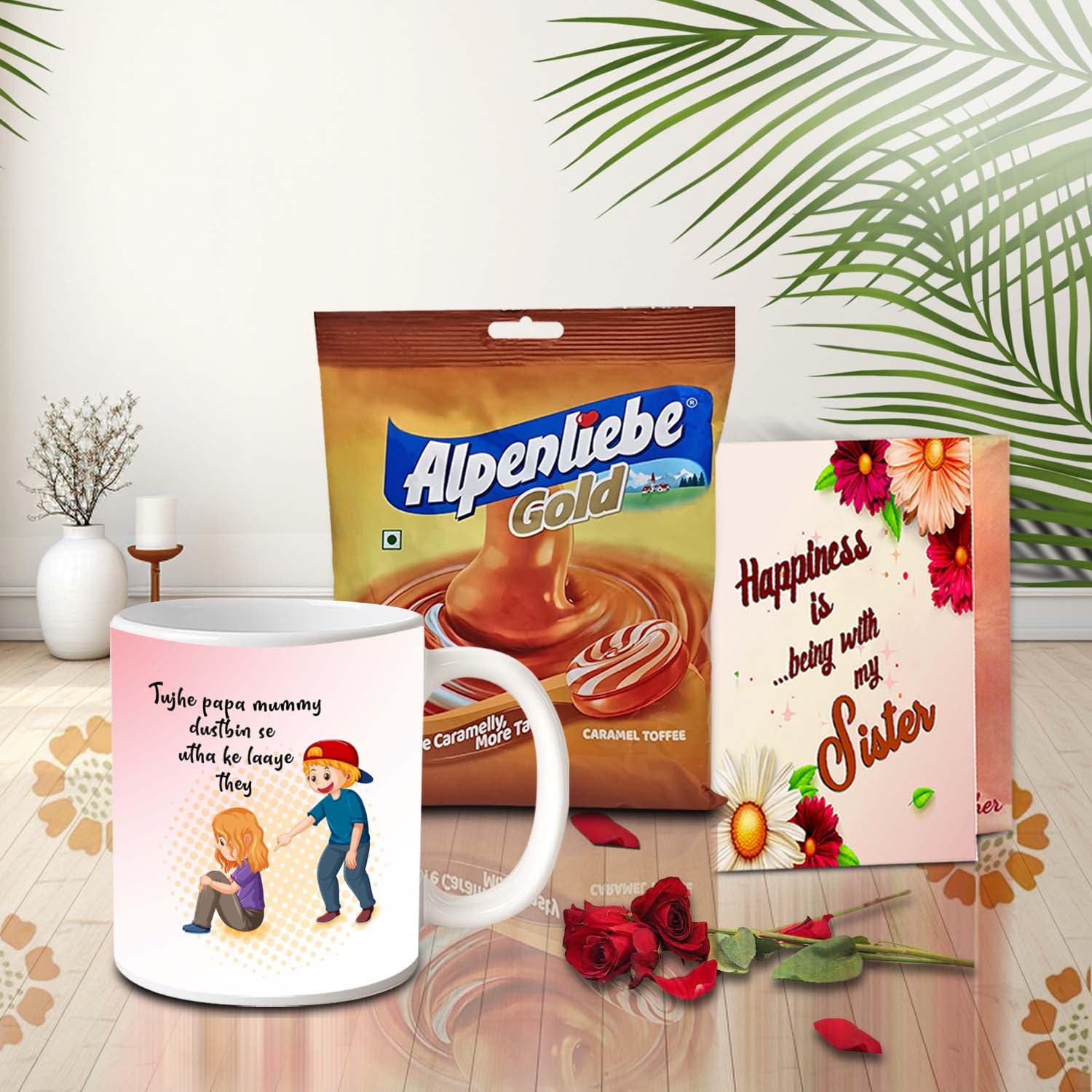 Introducing the “Sweet Sips & Sisterhood Rakhi Gift Set”—a thoughtfully curated gift that reflects the warmth and affection between siblings. Whether you're celebrating across the dining table or across time zones, this gift makes sure your love reaches her heart. With a stylish designer printed coffee mug, a pouch of delicious chocolate candies, and a heartfelt greeting card, this gift set wraps emotions into every element—making it the perfect Rakhi surprise for your sister.