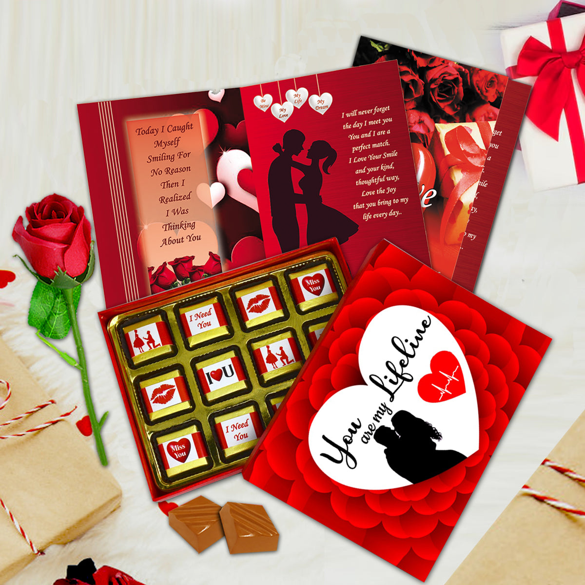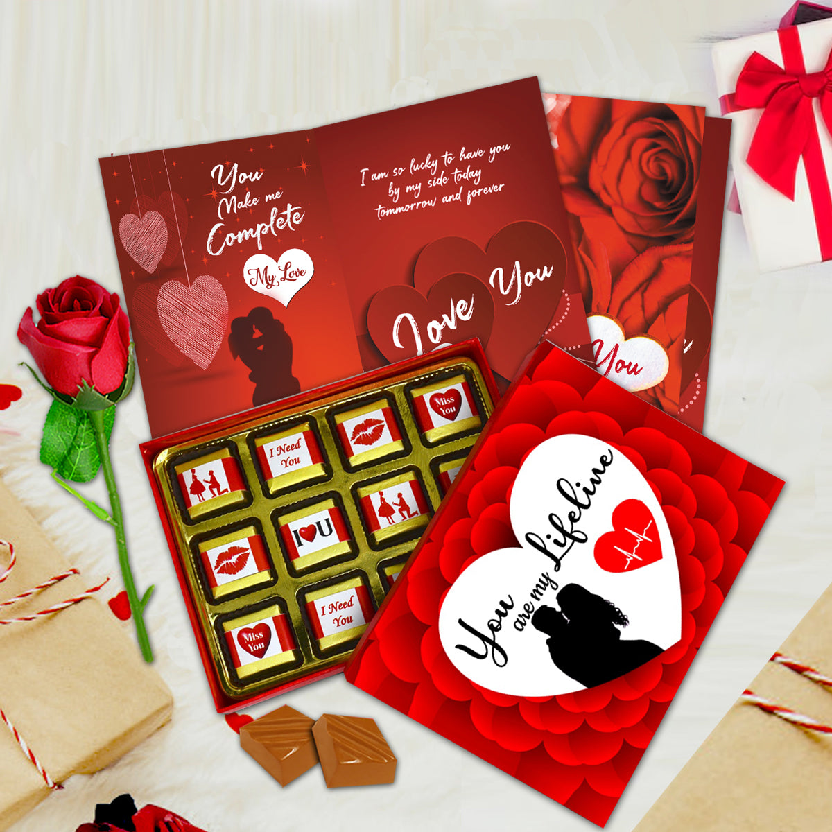 This love gift set combines chocolates, an artificial red rose, and a love greeting card, creating a complete romantic surprise. Thoughtfully curated to express love, care, and emotions in a simple yet meaningful way.