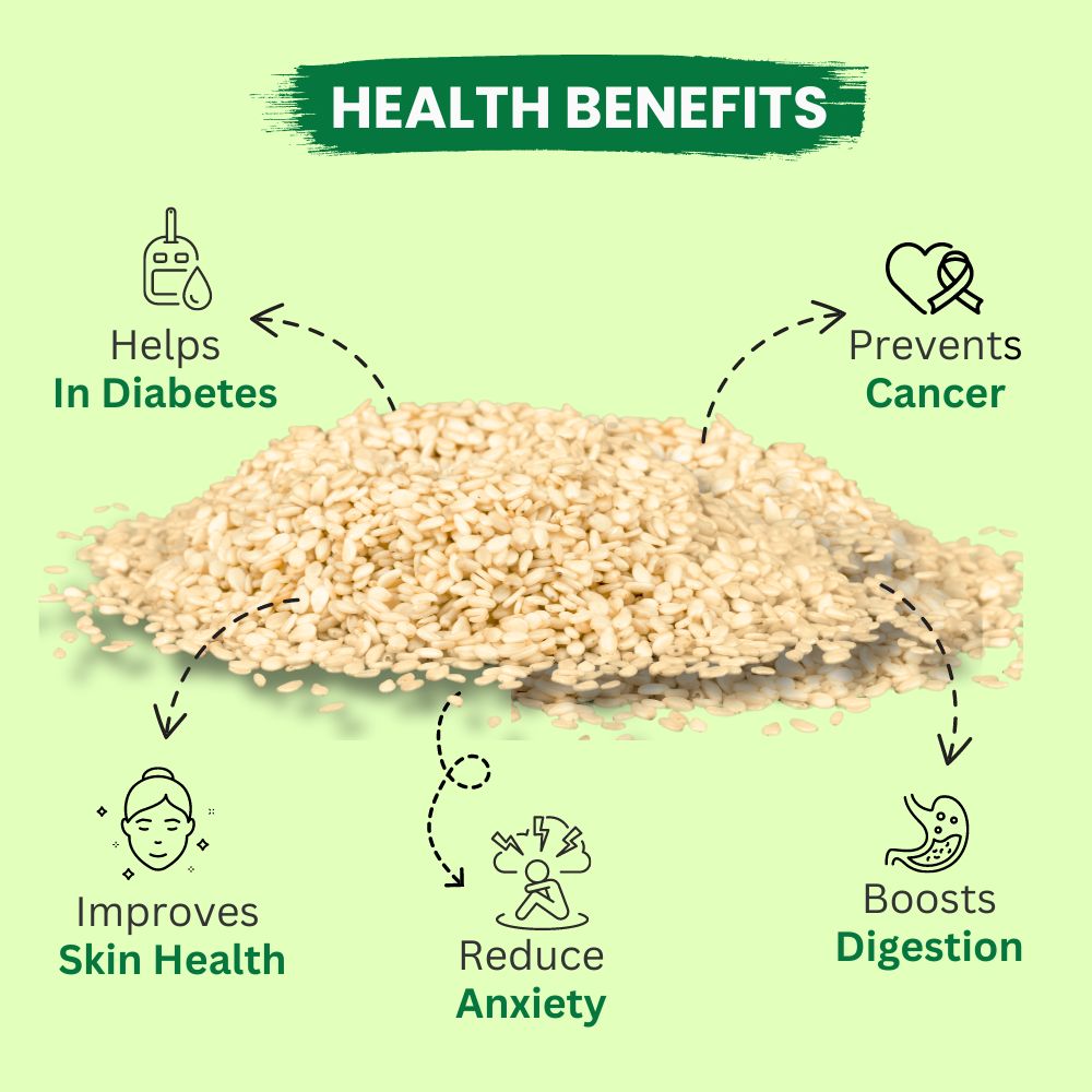 Sesame Seeds (550g) are rich in dietary fiber, which plays a vital role in supporting digestive health. The fiber content helps regulate bowel movements, promotes gut health, and relieves constipation. Incorporating sesame seeds into your diet can also improve digestive wellness, reduce bloating, and support a healthy gut microbiome, making them a great option for those seeking to enhance their digestive function and overall wellness.