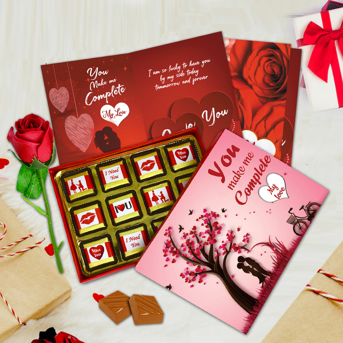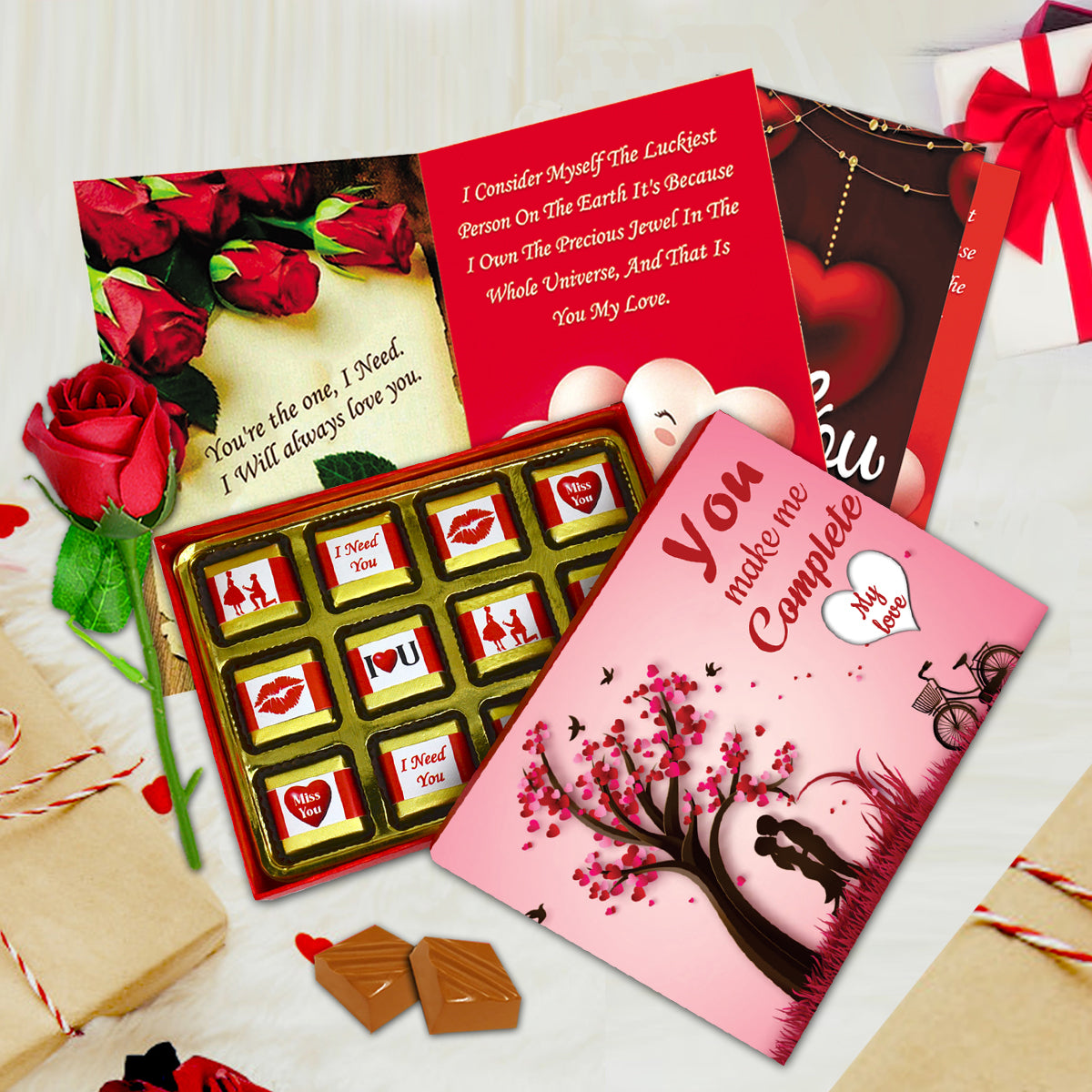 Includes chocolates, artificial red rose, and greeting card. A thoughtfully curated romantic gift set designed to express love, care, and emotions beautifully.